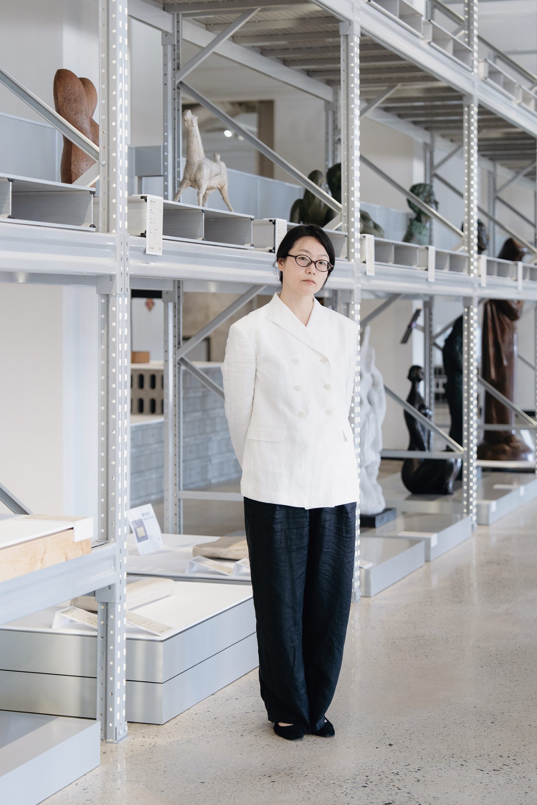 미술관 가장 중심부에 자리한 1층 개방 수장고는 커다란 유리창으로 한눈에 볼 수 있게 건축했어요. 건물 바깥에서 미술관 내부의 작품이 그대로 드러나고 수장고를 위해 특별하게 디자인한 진열장 위에 많은 작품이 빼곡히 자리하죠. 개방 수장고는 한 벽면이 모두 유리로 되어 있어 회화나 사진 같은 평면보다 상대적으로 환경 변화에 강한 돌, 나무, 청동과 같은 재료로 만든 조각 작품으로 구성돼 있습니다. 현대 동시대 미술이 다양한 형태를 보이면서 난해하다고 생각되는 작품이 많은데, 국립현대미술관 청주의 개방 수장고는 전통 조각 재료로 만든 자연, 인물 등의 형상 작품이 중심이라 관람객이 친숙함을 느낄 수 있을 거라고 생각해요.