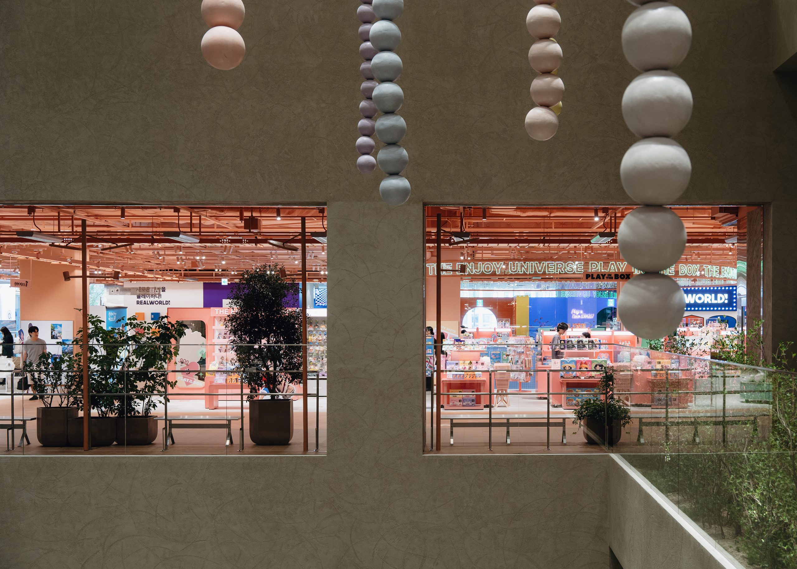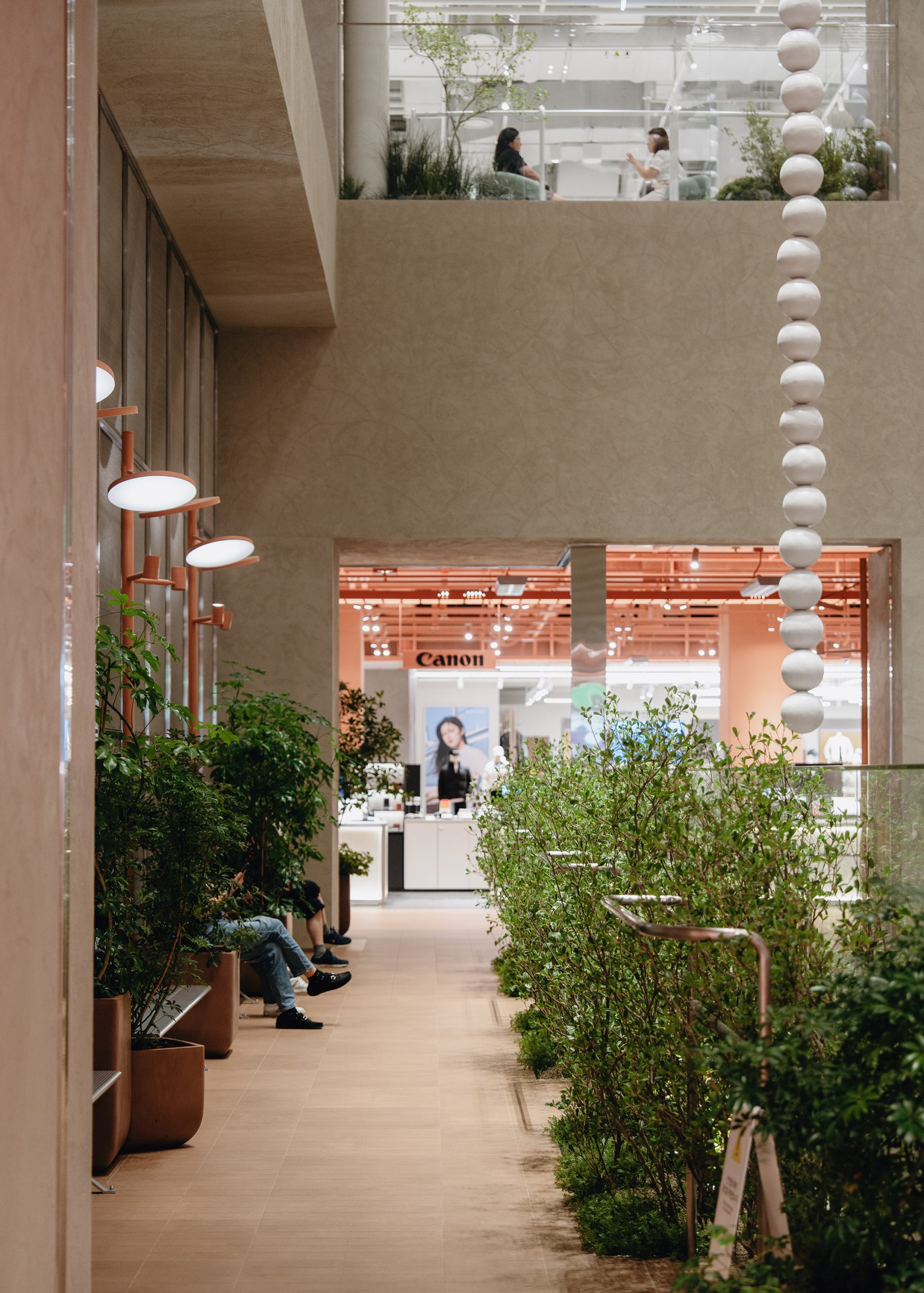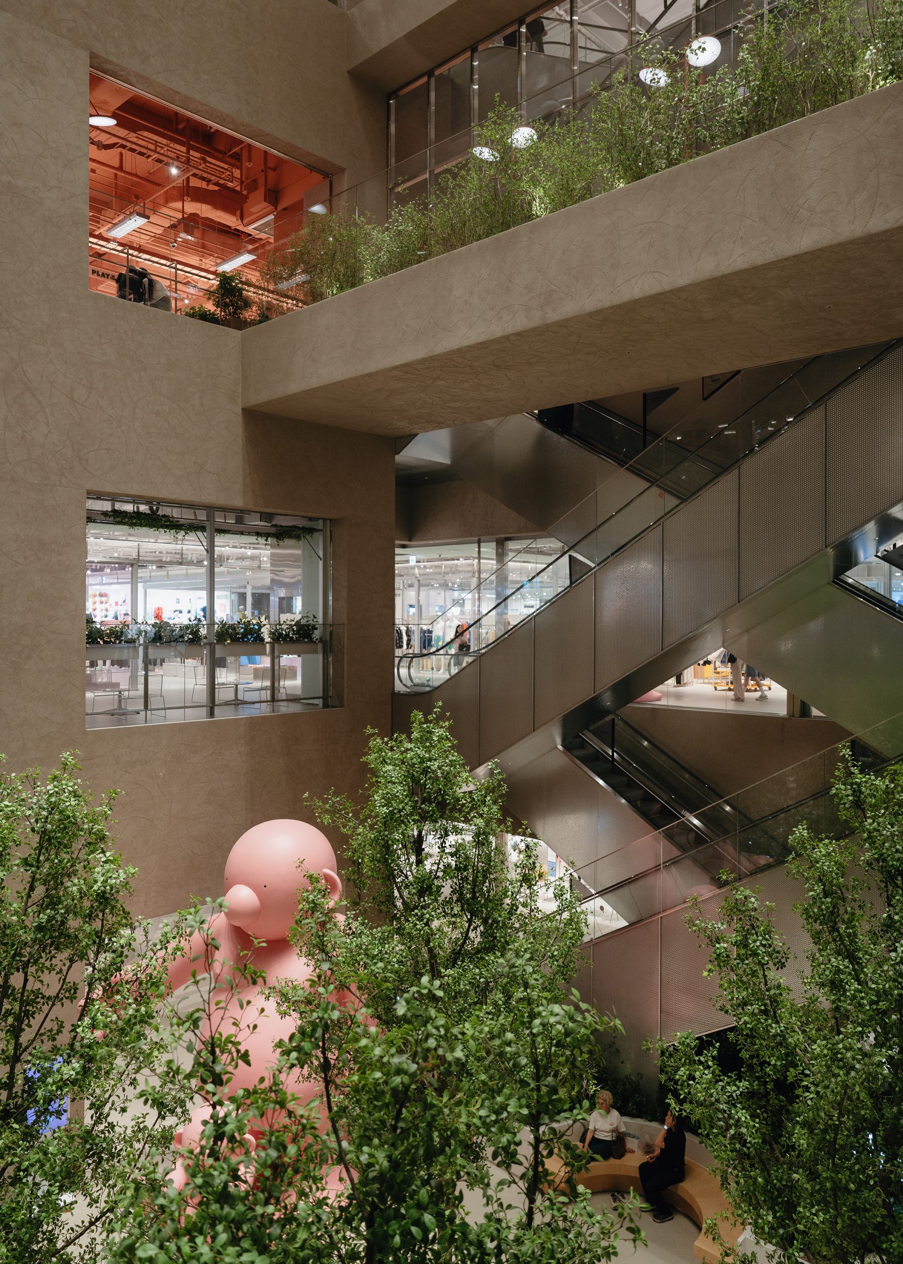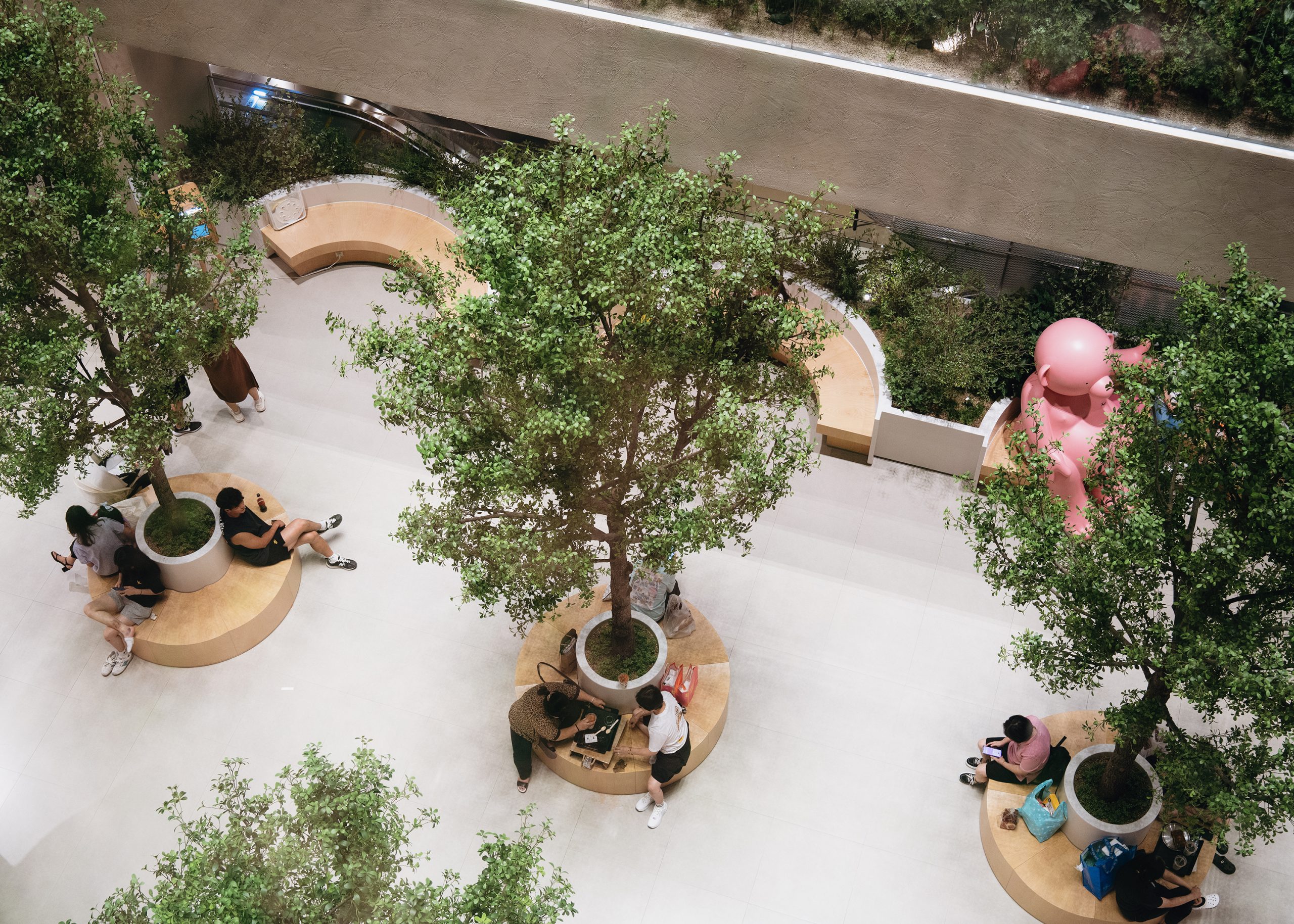 프랑스 비주얼 아티스트이자 뮤지션, 작곡가 겸 배우인 필립 캐서린Phillip Catherine의 조형 작품 미스터 핑크와 식물이 함께하는 1층 중앙의 휴게 공간. 커넥트현대 청주에는 쇼핑·체험형 콘텐츠, 문화 공간을 비롯해 고객이 편하게 쉴 수 있는 쉼터를 중심에 두거나 자투리 자리를 활용해 휴게 공간을 마련했다.