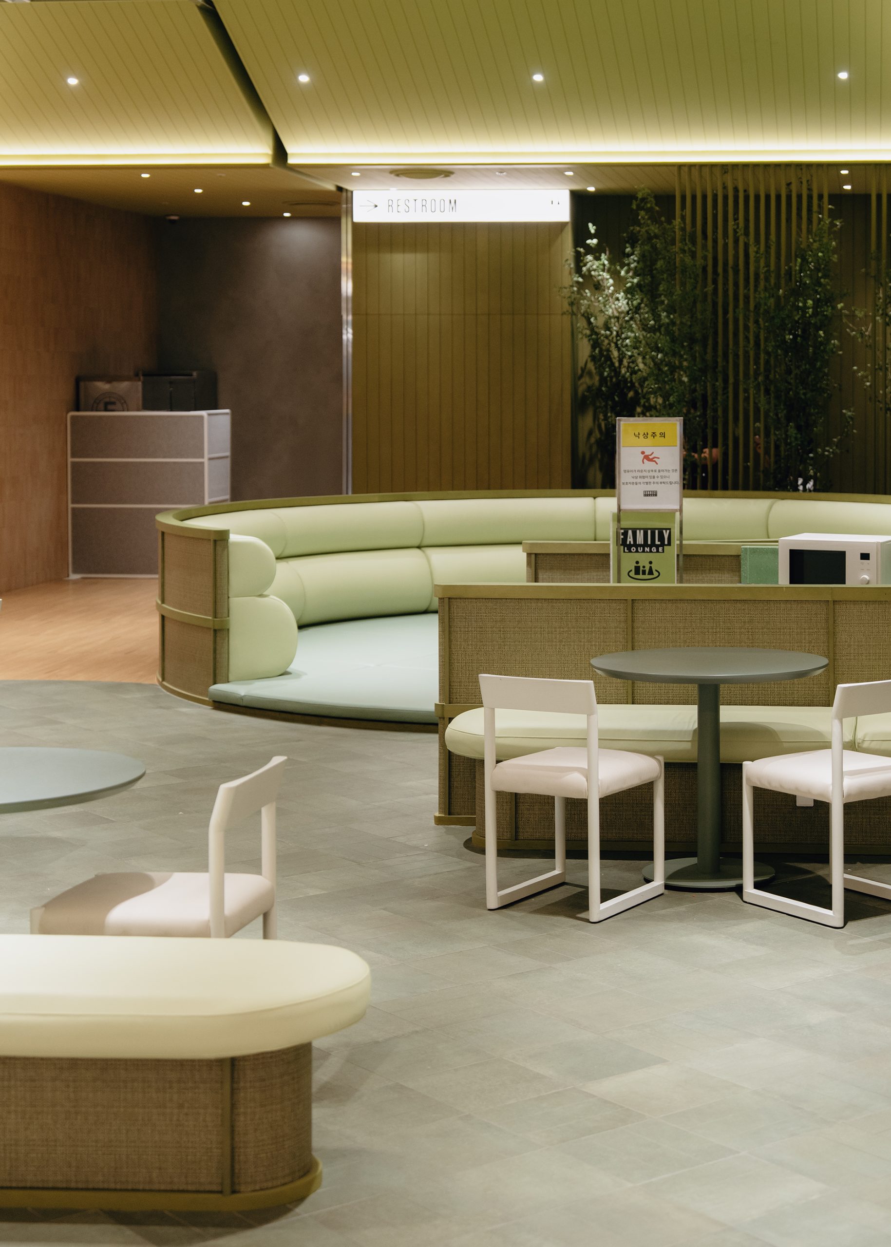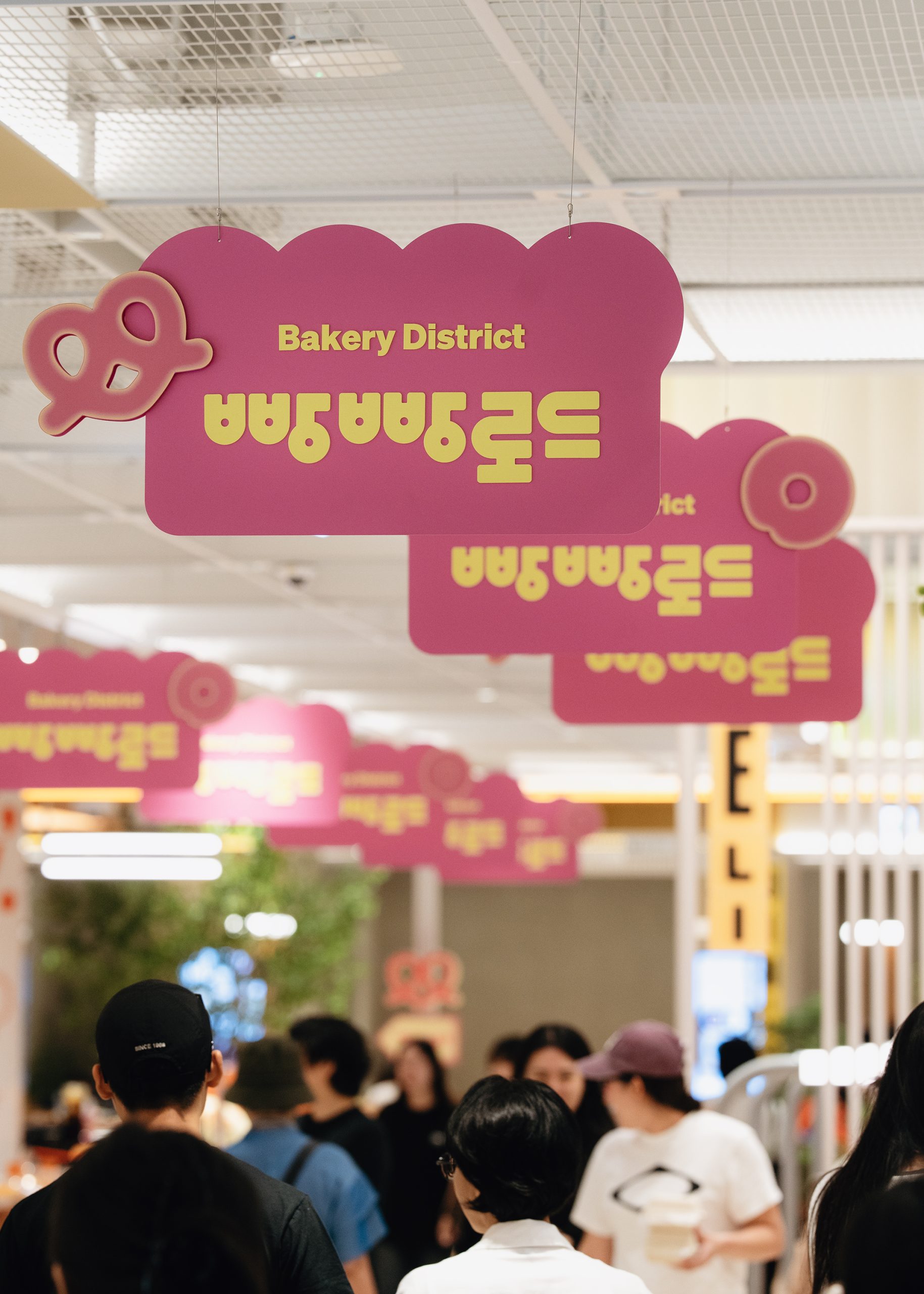 이웅희 당연히 공간에 따라 상품의 배치 방식이나 수량이 달라져요. 보통 백화점에서 F&B를 즐길 수 있는 공간을 지하에 두는데, 커넥트현대 청주는 F&B 브랜드가 포진되어 있는 GF층의 문을 열면 바로 청주고속버스터미널과 연결되는 구조라 평수가 870평 정도로 상대적으로 작은 편이에요. 그래서 지상 광장을 지나 처음 백화점에 들어서는 GF층 푸디 스테이션의 공간을 어떻게 하면 가장 효율적이고 흥미롭게 만들 수 있을지 고민을 많이 했어요. 그 결과 현대백화점에서 F&B와 관련한 여러 일을 해오면서 개인적으로 만족도 높은 매장이 완성되었죠. 좌석 공간에 따라 휴게 공간에 방점을 둔 공간이 될 수도, 식사를 하는 기능에 맞춘 공간이 될 수도 있어 식품 공간 파트에서 절대적으로 중요한 것 중 하나가 좌석이에요. 상품의 적정 양도 이를 기반으로 정해지고요. 커넥트현대 청주는 할당된 면적 안에서 음식을 편하게 먹고 쉴 수 있는 공간을 중요하게 생각해 타점 대비 5~10% 좌석 공간을 늘렸어요. 패밀리 라운지, 팻 라운지가 그 고민의 결과 중 하나입니다. 식음료를 판매하는 테넌트 공간도 중요하지만, 고객이 편하게 먹으며 쉬다 갈 수 있는 공용 휴게 공간 활용을 확장하면서 판매 공간, 상품, 휴게 공간을 연계해 적정성을 검토하는 데 심혈을 기울였어요. 식품관이라는 게 맛의 품질도 중요하지만, 처음 이 공간에 발을 디뎠을 때 시각적으로 얼마나 개방감 있고 편안한 공간에서 식사를 할 수 있는지 또한 중요하다고 본 셈이죠. 둘러보면 아시겠지만, 좌석 배치도 한 방향으로 쭉 연결되어 있거든요. 상품의 경우는 터미널과 붙어 있으니 편하게 사서 먹거나 포장할 수 있는 식음료와 선물용 상품을 디테일하게 연구·개발하는 데 주안점을 뒀어요. 빵빵로드가 청주 로컬 베이커리를 발굴하는 동시에 터미널에 들렀을 때 간편하게 포장해 갈 수 있도록 기획한 프로젝트죠.